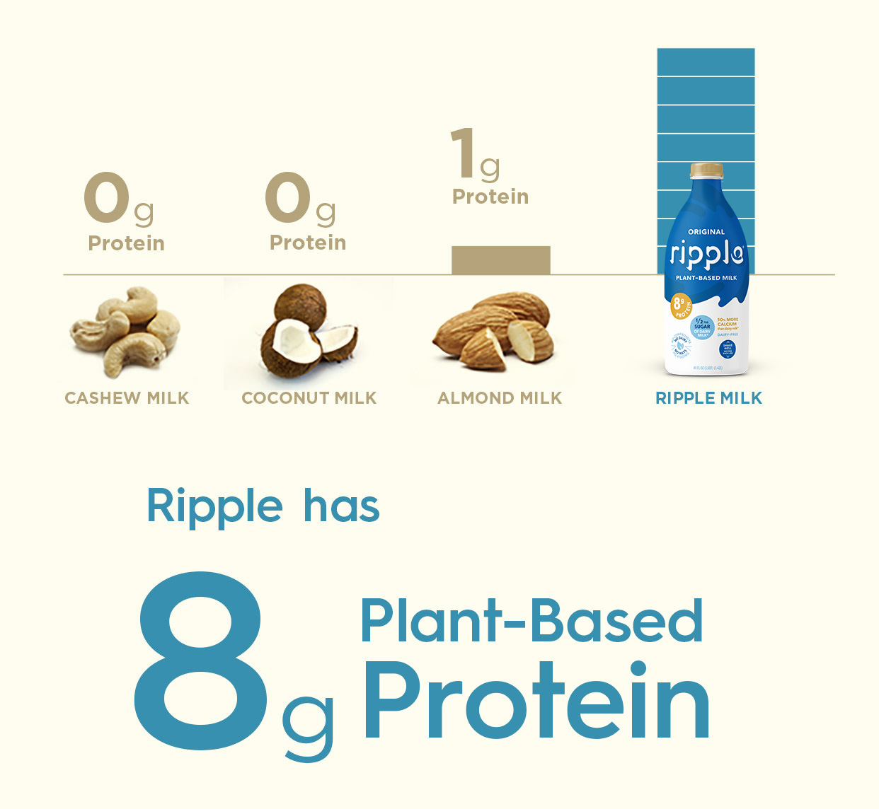 Ripple has 8g of plant-based protein per serving. That’s the same as dairy milk and 8x more than other dairy alternatives.